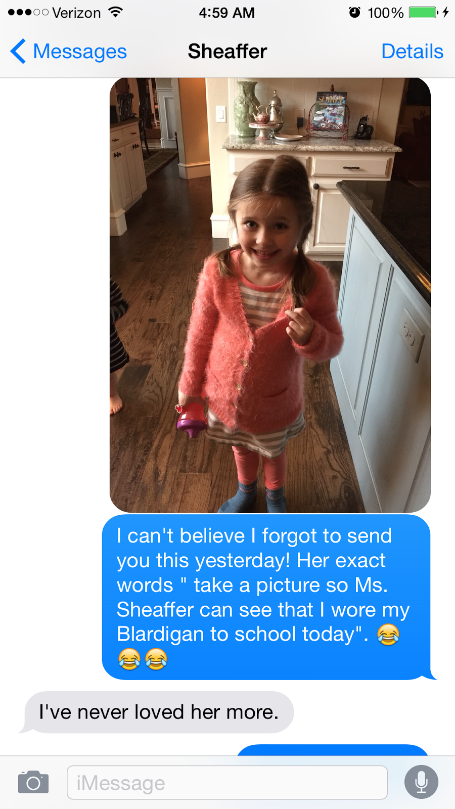 Kensington walked into the kitchen and told me to take this picture for Ms. Sheaffer so that she knew she wore her blardigan to school that day. Hahaha! My kid knows what a blardigan is…because it’s the best thing ever and her mama wears it all winter long!