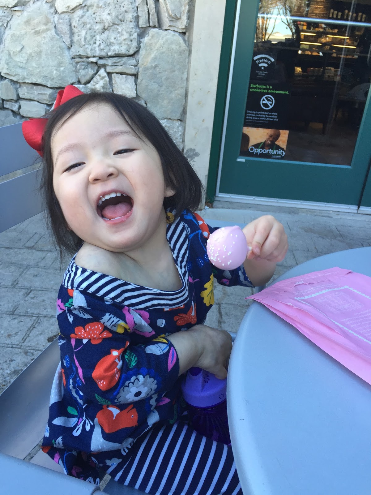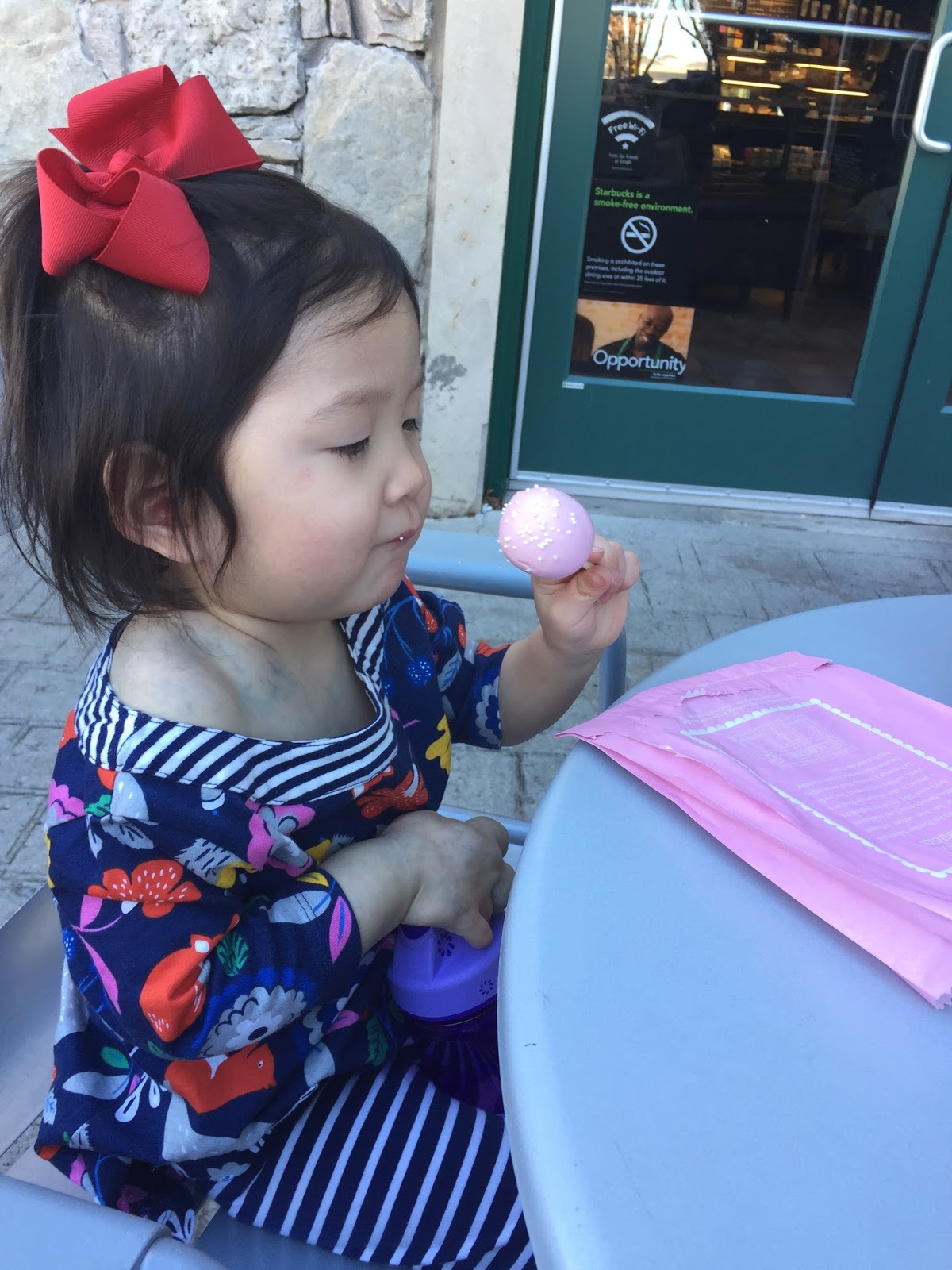 Sweet Narci invited Smith to play, so Ashby and I had some girl time. It was nice, so we decided to go to Starbucks and sit outside. I bought her a cake ball for the first time. She’s like what is this???