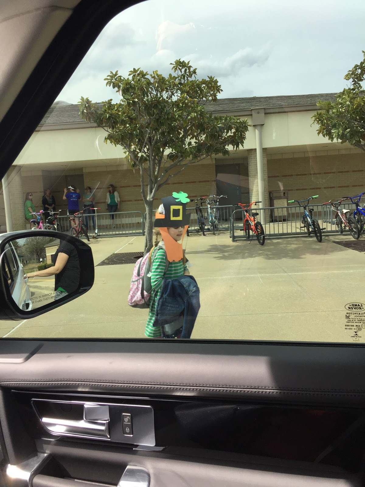 On Tuesday, I waited in carpool line to pick up Kensington, but ended up picking up a leprechaun instead.