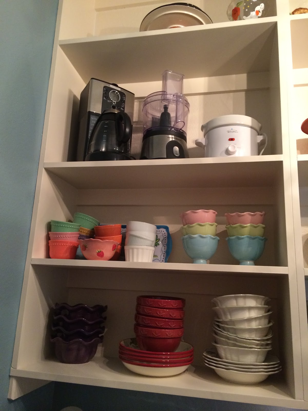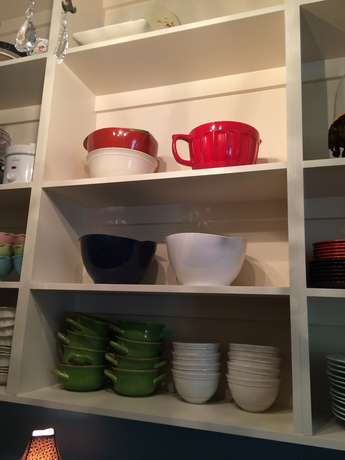 I keep our every day dishes and serving pieces in the upper cabinets.