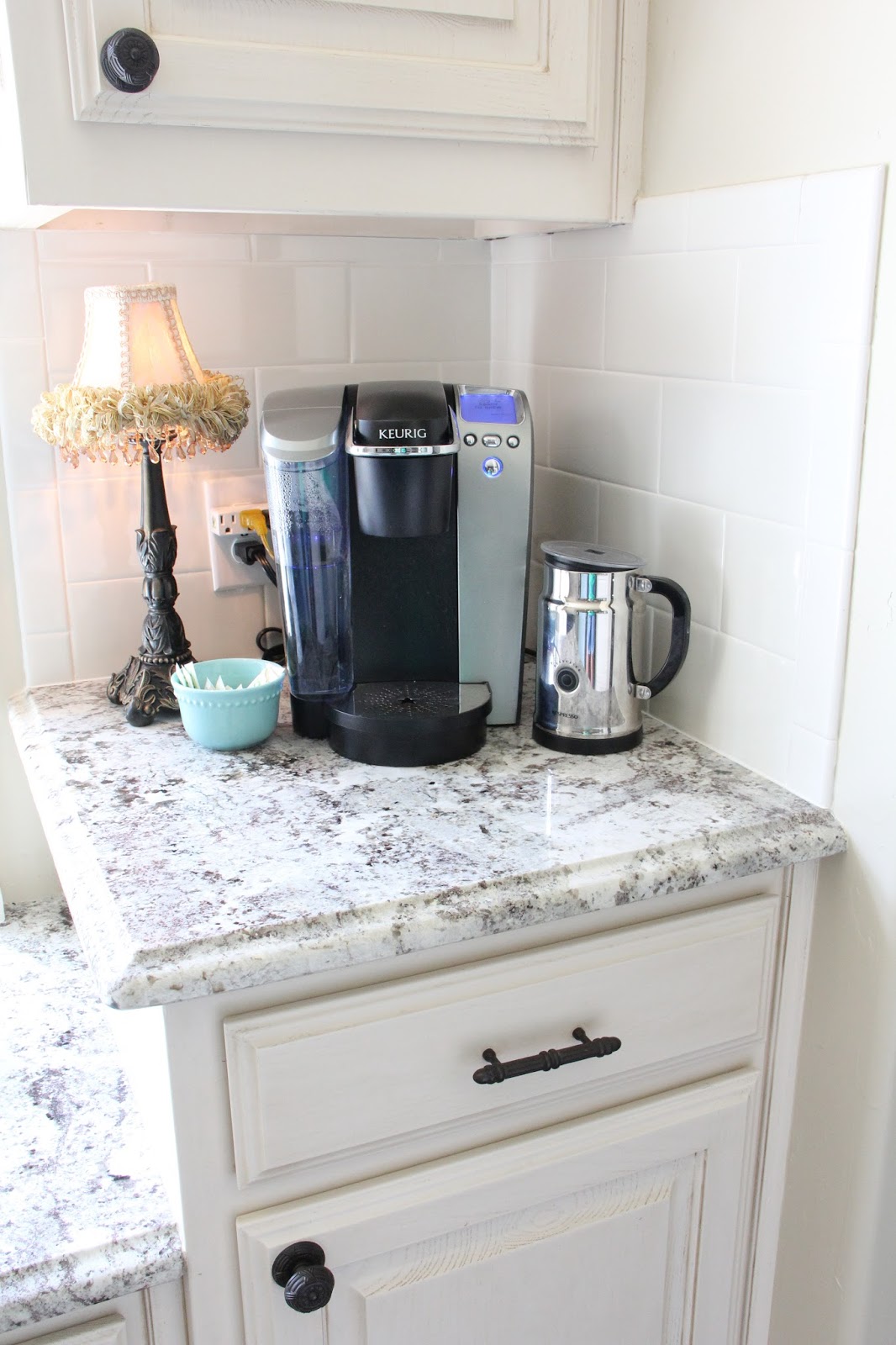 On the other side of the kitchen, I have cabinets and drawers underneath the counter for storage and then our most used appliances sit on the counter (with the exception of my Keurig…it sits out in the kitchen in my coffee bar area).
