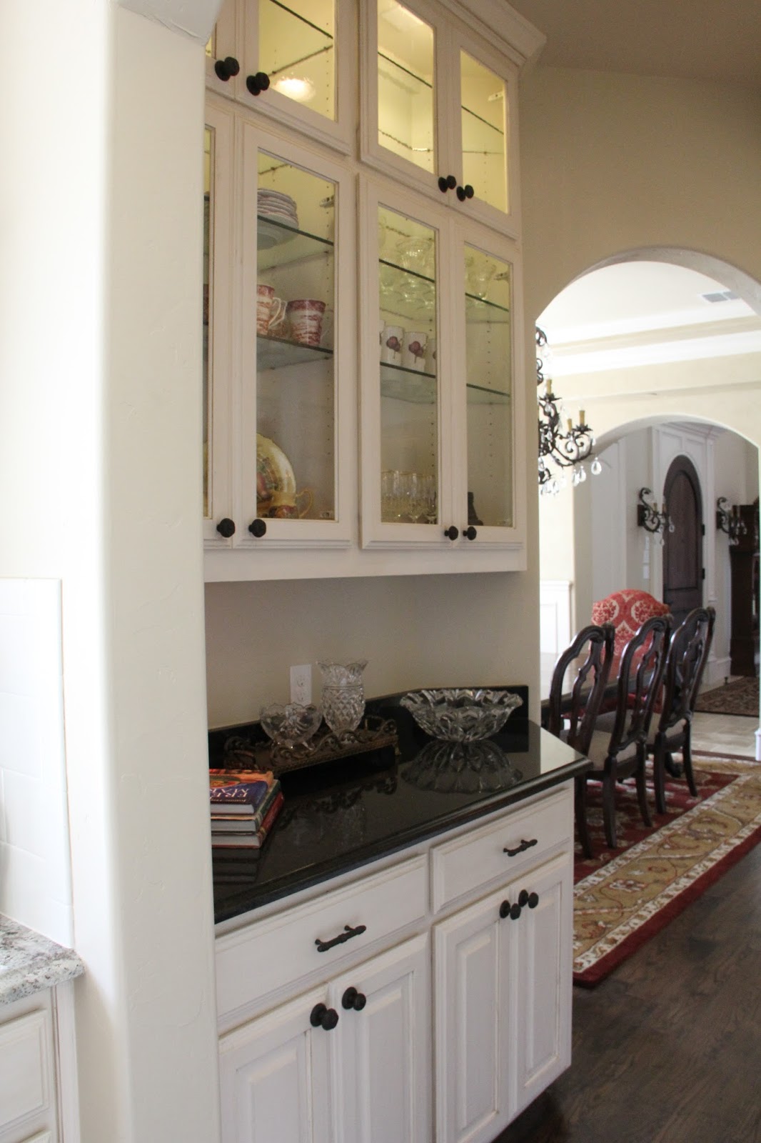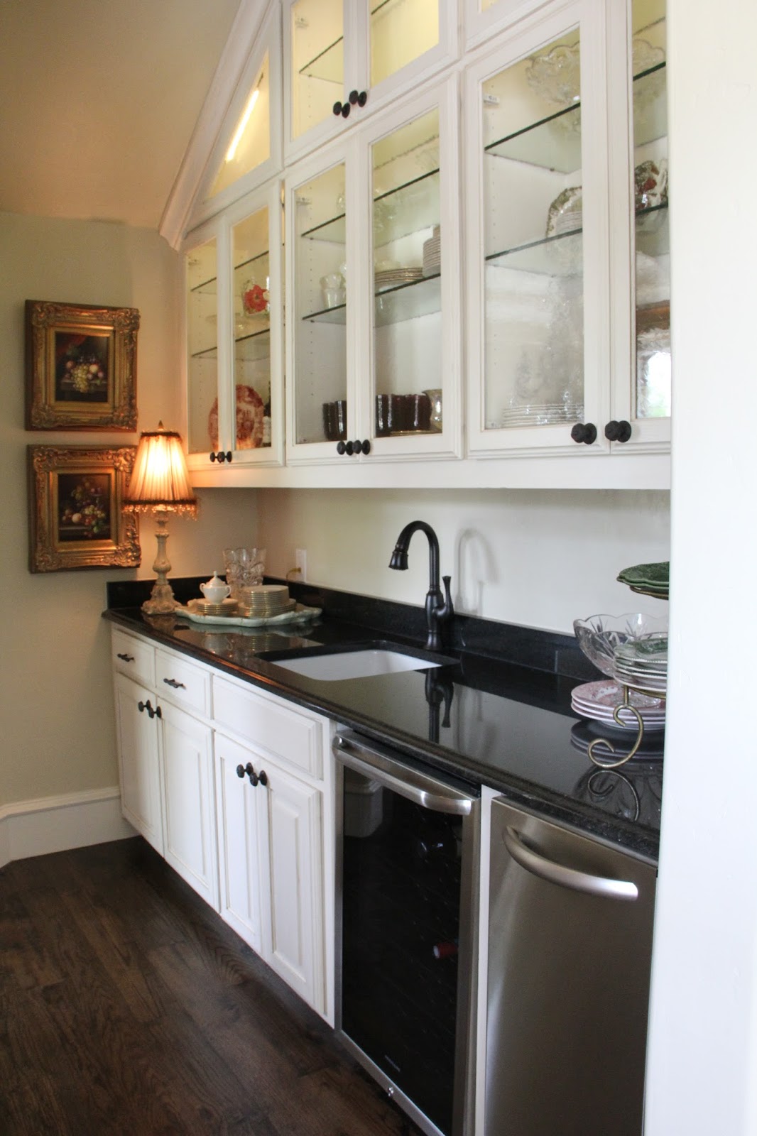 Right off of the coffee bar area is our little prep kitchen area. This little area (often called a butler’s pantry) is between the kitchen and dining room and holds an extra sink, mini fridge, ice maker and all of our china, seasonal dishes and serving pieces.
