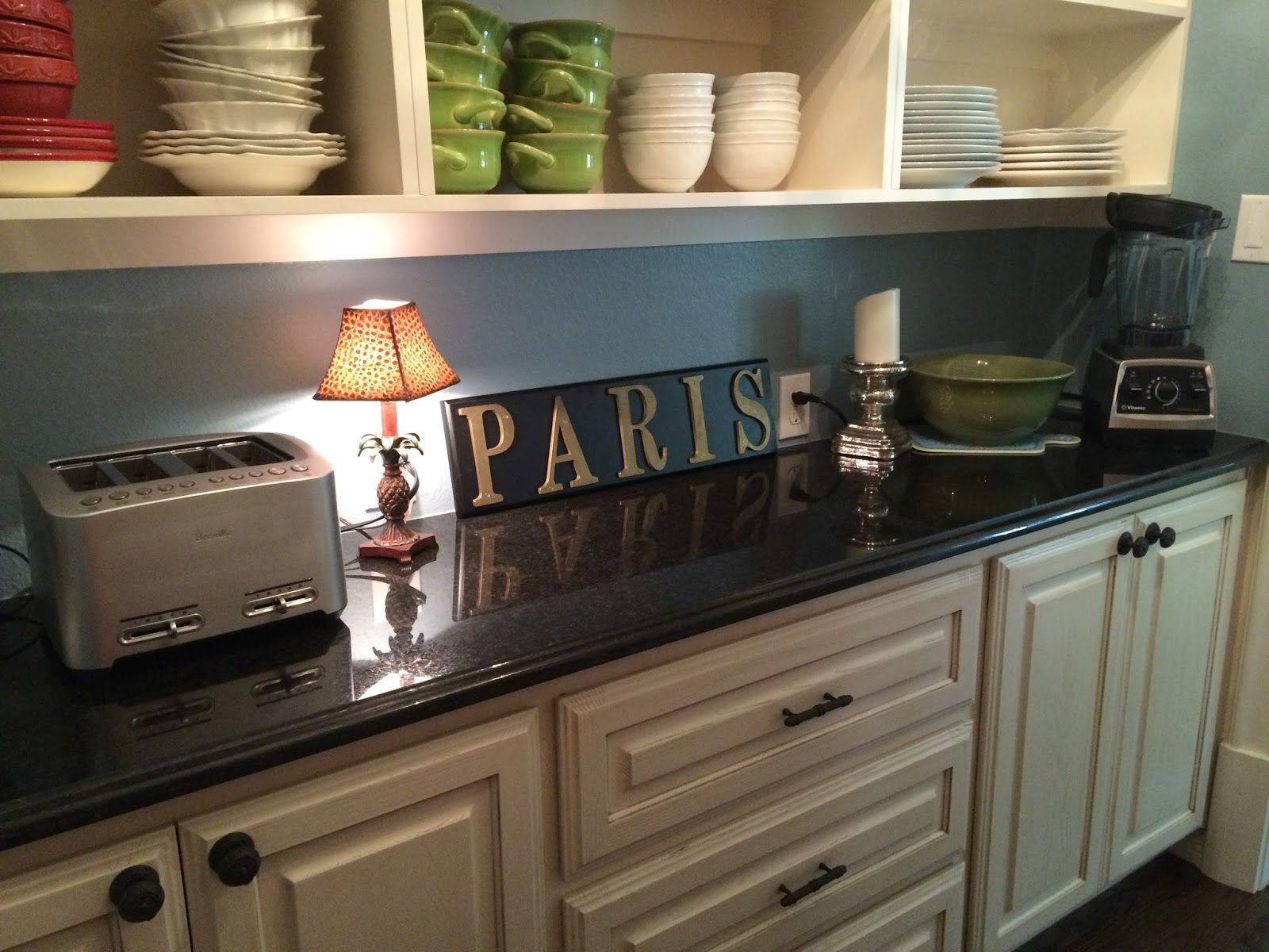 This is looking in with the door open. My walls are a blue-grey color and my counters are black granite. I had my friend Amy make me a piece of subway art with my favorite dessert recipes on it and I have a step stool for reaching some higher shelves.