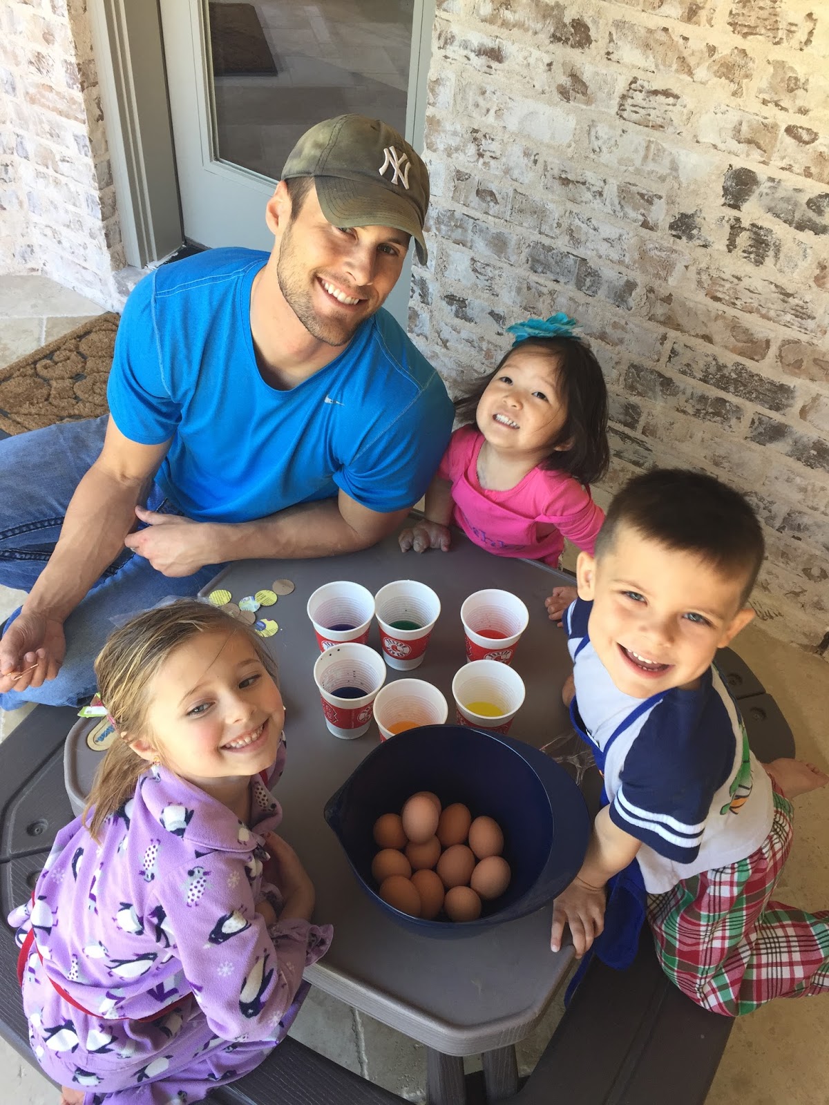 On Saturday morning, we sat outside and dyed our Easter eggs. Last year, I read on Pinterest that if you dye brown eggs, the color will be more intense. So, that’s what we do and it totally works! The only down side is that you have to leave the eggs in the dye longer with brown eggs but the color is really pretty when you’re done.