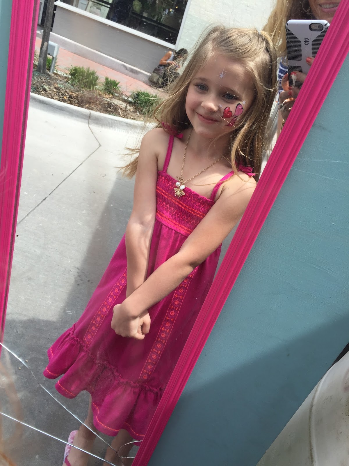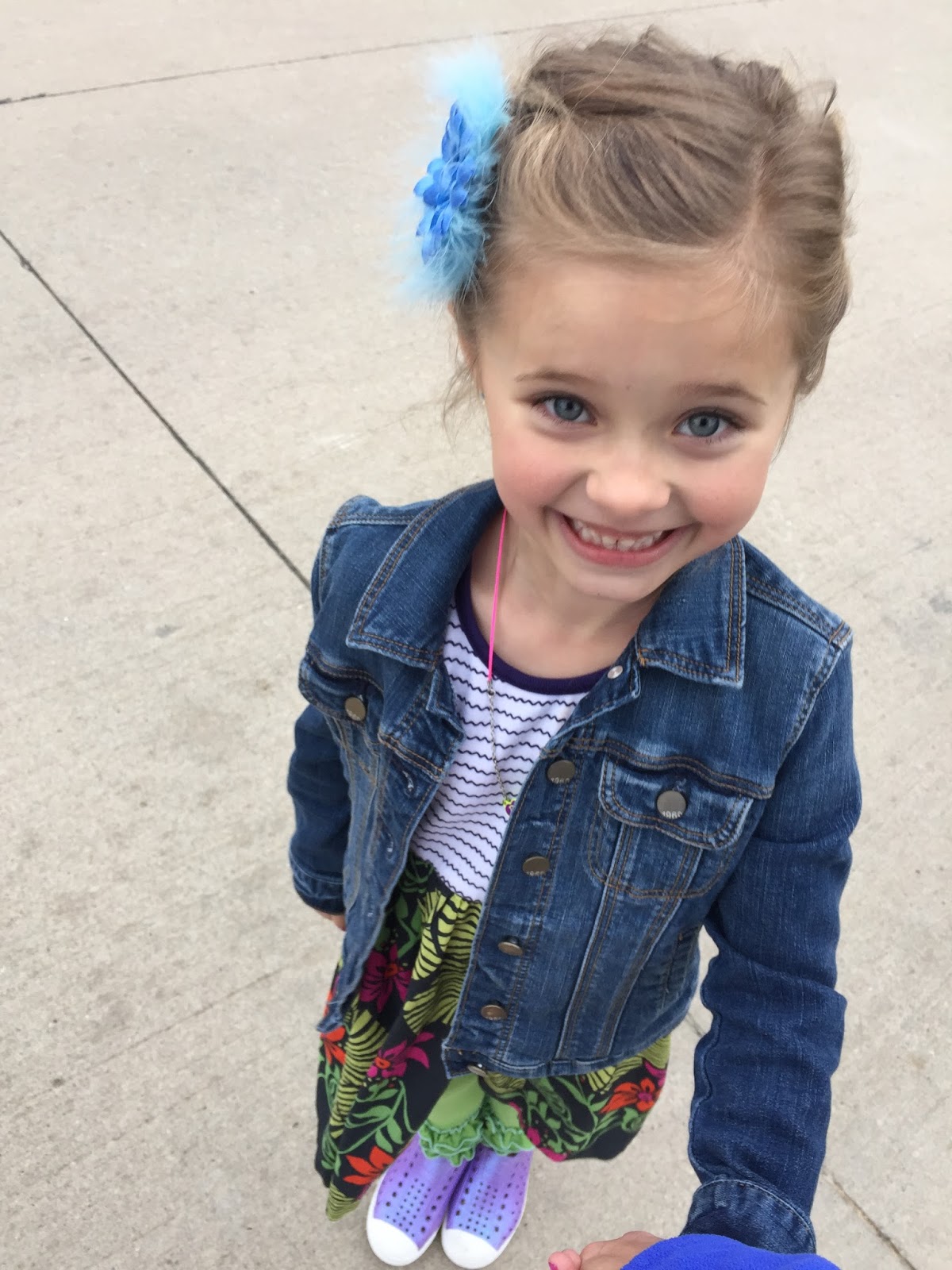 Kensington slept in her fancy hair and wore it to school the next day. Here we are walking to school. I asked her to show me her TGIF face. She nailed this one…and these too…