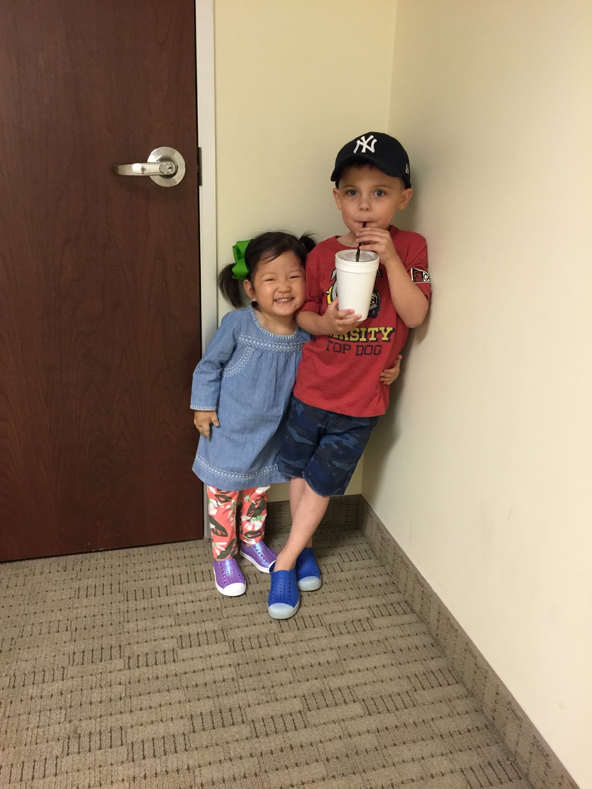 And on Monday when we were leaving the gym, we were waiting to use the ladies’ room when I snapped this pic. I love these two so much! They melt my heart (and their big sister too!).