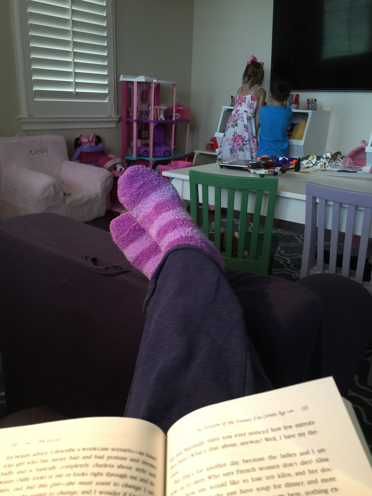 My kids often play in the house without my supervision :). This was a rainy Memorial Day afternoon and we have some super comfy chairs in our play room…so it was the best of both worlds…I read and they played.