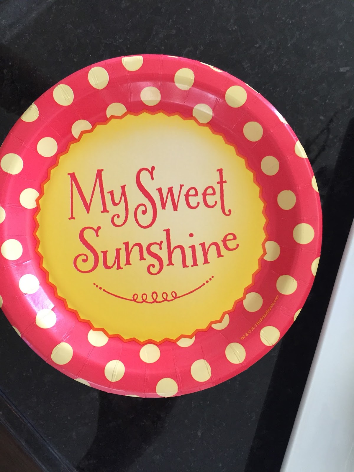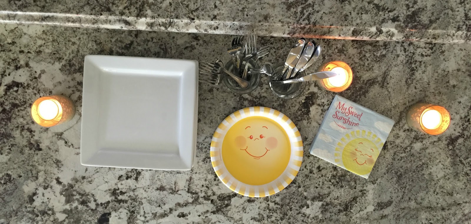 I served the kids’ dinner on sunshine plates and then everyone got a sunshine napkin (found them online at Birthday Express).