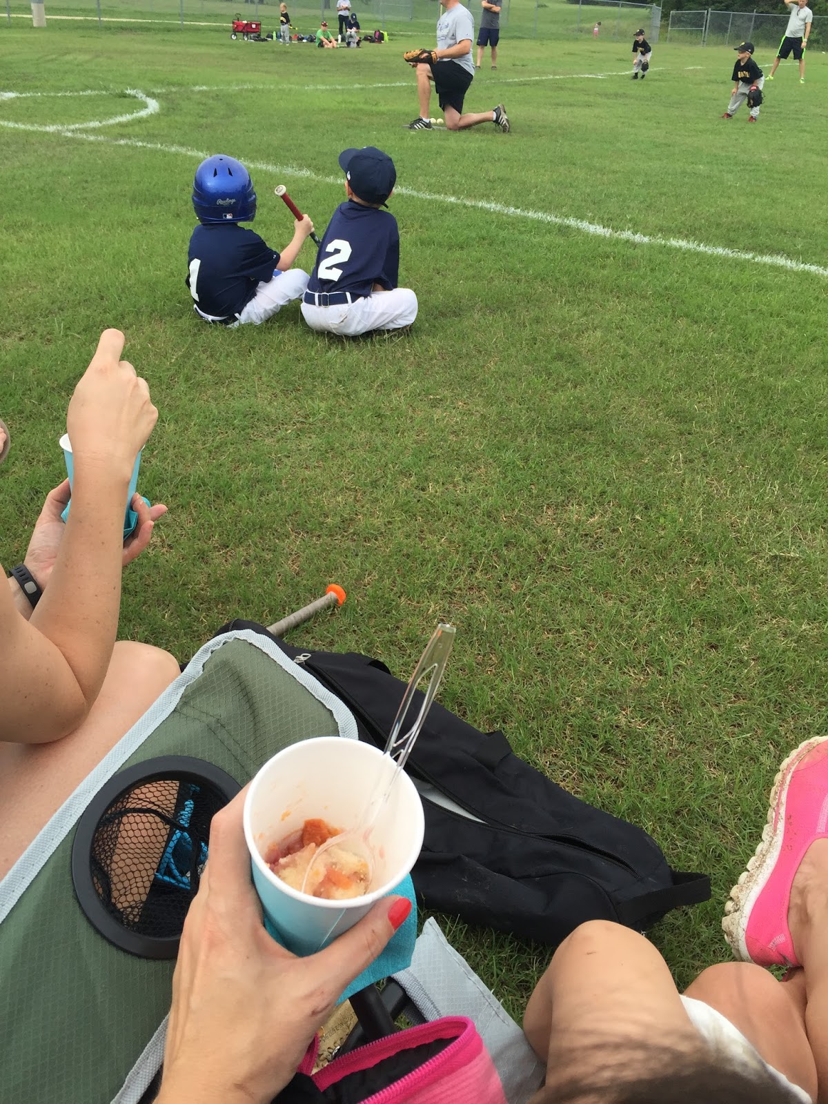 I mean…baseball this season will not be forgotten. We missed something like 11 games in a row due to weather and are now making them up. The fields are so wet and saturated that they’re having us play in the outfield with no dugout or bleachers for fans, so we drag our lawn chairs across the mud and sit right next to the makeshift field and watch. On this particular night, our friend Meagan brought homemade cobbler for us to enjoy while we swatted mosquitoes and cheered on our boys in the mud. As you can see, Sheaffer and I got all cozy in our lawn chairs with our peach cobbler. When you’re eating cobbler in the outfield, you know that baseball has taken a weird turn…