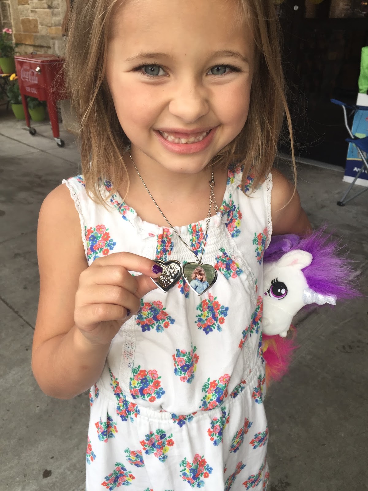 Looks like y'all are enjoying your summer! Kensington looks so pretty and grown up in the picture with her locket! How sweet is she to put your picture in it 🙂