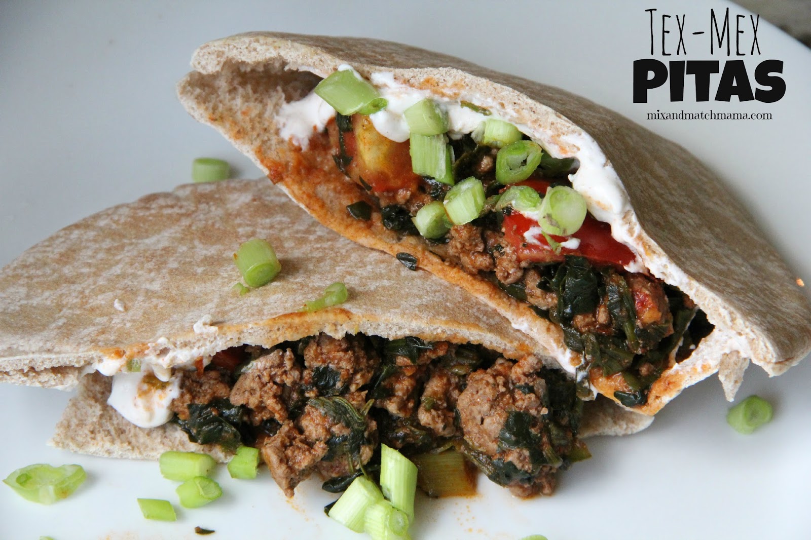 Take your warm pita halves and spoon the ground beef mixture down inside. Add a little sour cream to each one and then finish off with an extra green onion or two. You could also get really fancy and add in some grated Cheddar cheese.