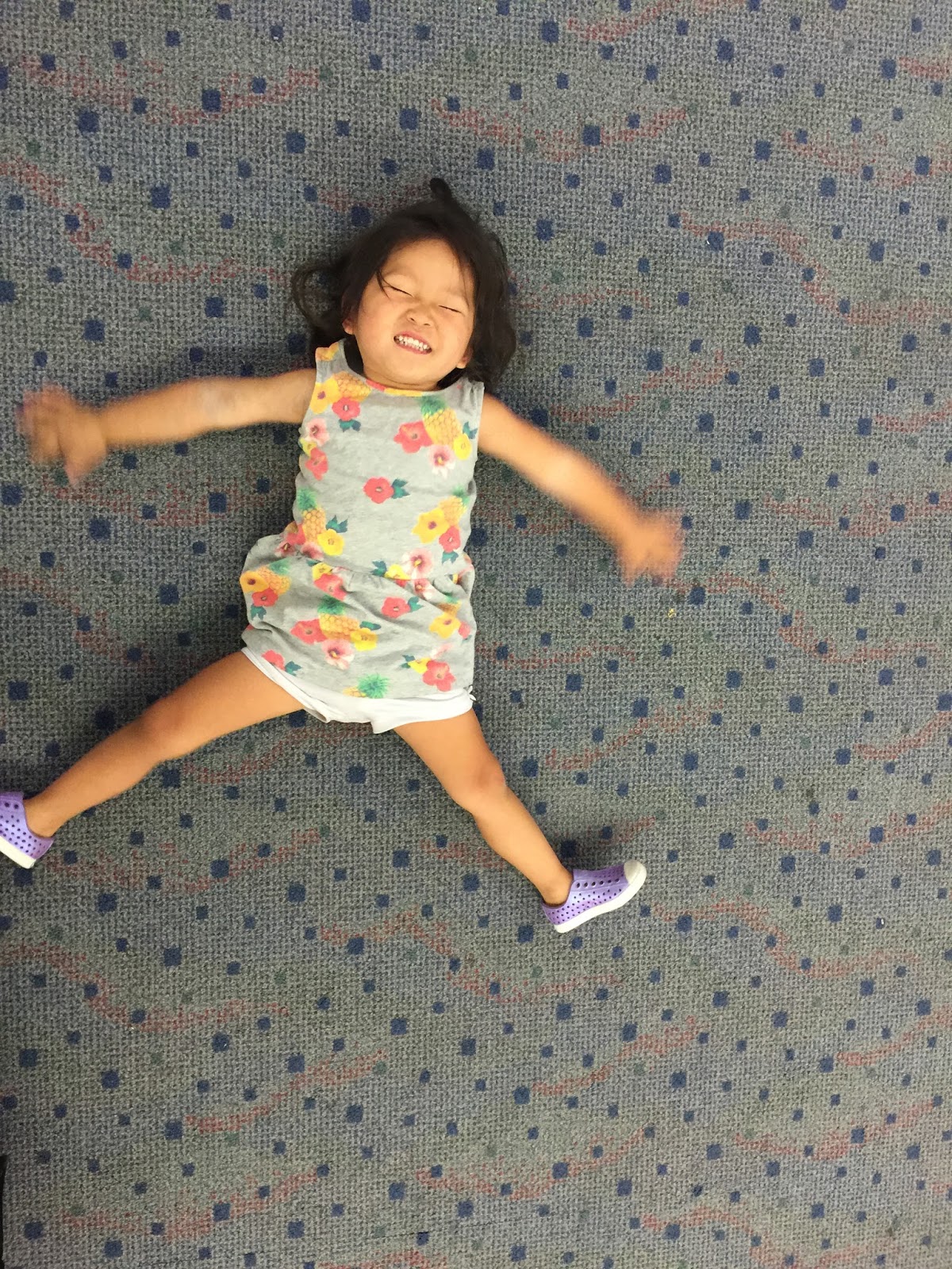 …we landed at DFW Airport after over 24 hours of being awake and traveling. And Ashby is making carpet angels (completely oblivious to the fact that she should be tired)…and Kensington…