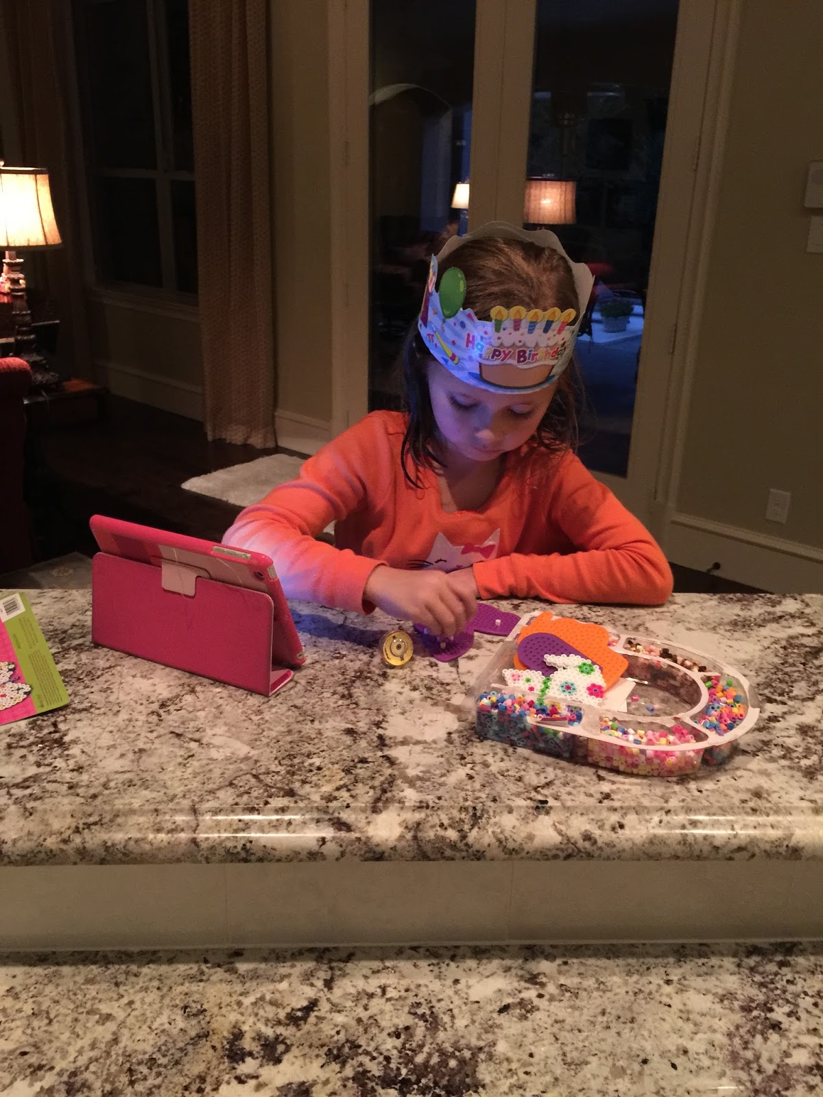 After her shower, she stayed up a few minutes later than the two younger kids and worked on her bead art while also watching a movie on her iPad…and she still wore her crown.
