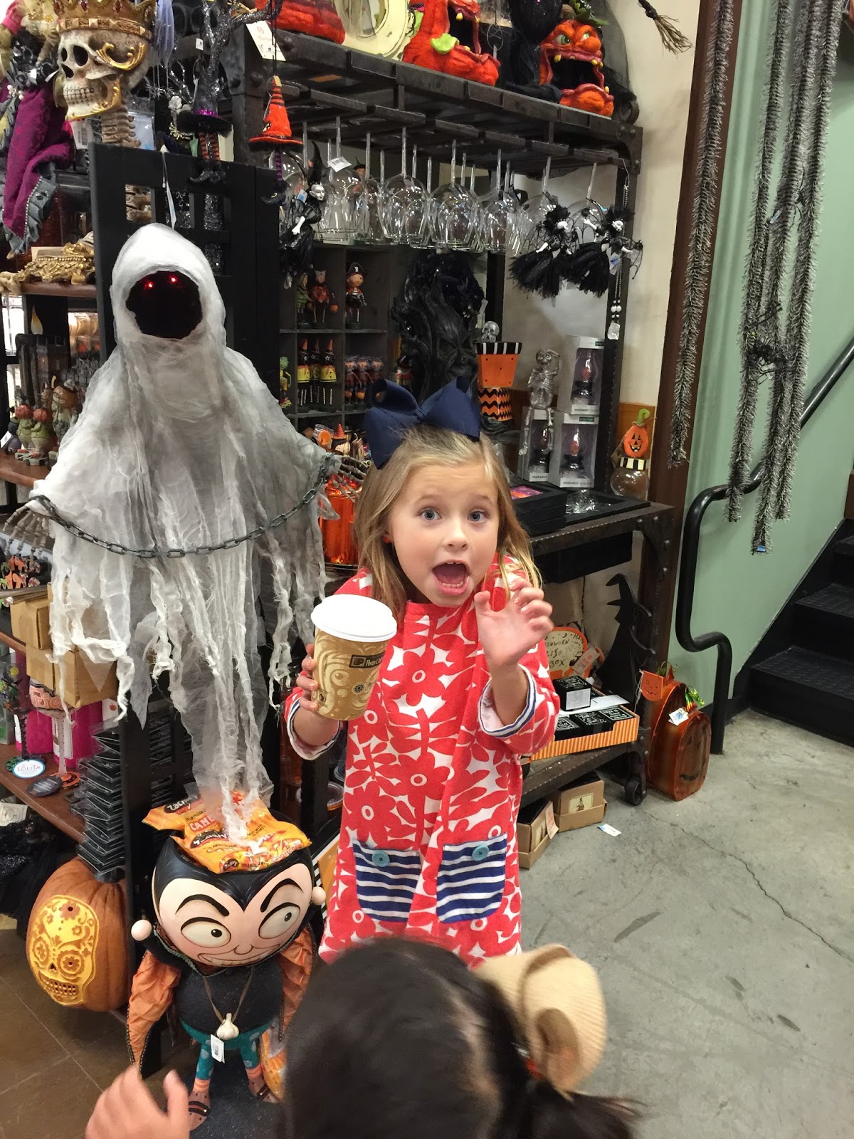 We randomly had the best little morning at the grocery store on Saturday. Smith had an 8:00 AM baseball game (ugh!), so after it was over, we ran into our local grocery store to grab a few things…and they had Halloween stuff out :). We really enjoyed drinking our coffee and such and checking everything out. Kensington loves to get into the spirit!