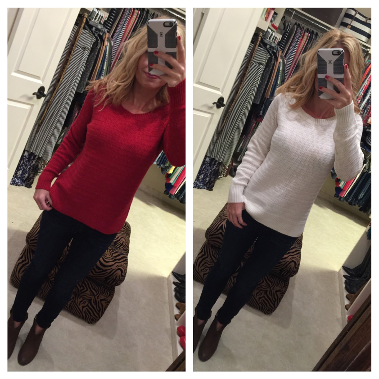 …y’all! Isn’t it cute?!?! And it’s so soft too! I mean…I’m pretty sweater sensitive and this one is by far the softest I’ve bought this year. It’s loose in all the right places and just comfy. I bought this red and white stripe with the grey detail but look at the other colors…
