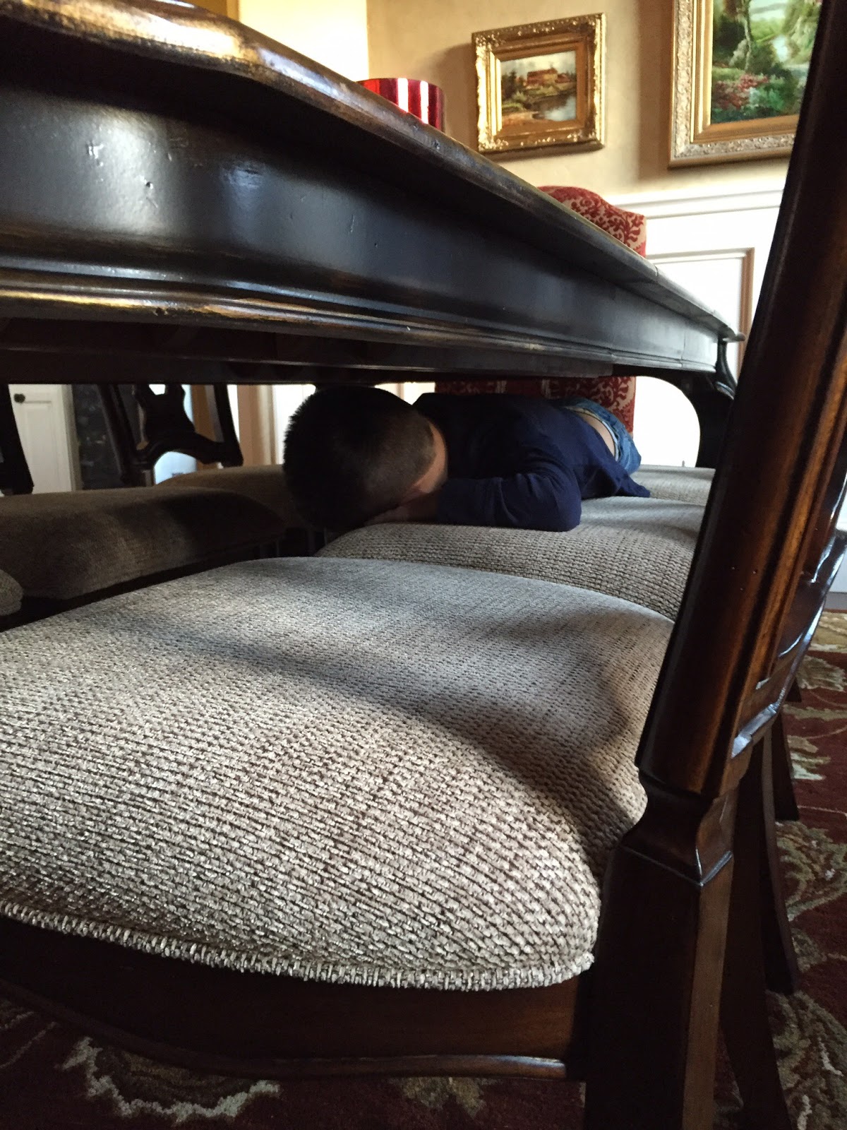 …we found him sound asleep under the dining room table. What in the world?! There were over 20 of us running around shouting his name and he was sleeping on the chairs the entire time. I mean…this kid is a mess! He didn’t feel well the entire day, and I told him not to go in his room because that’s where Sean and Catherine were staying, so I guess he thought the next best place to nap was here?!