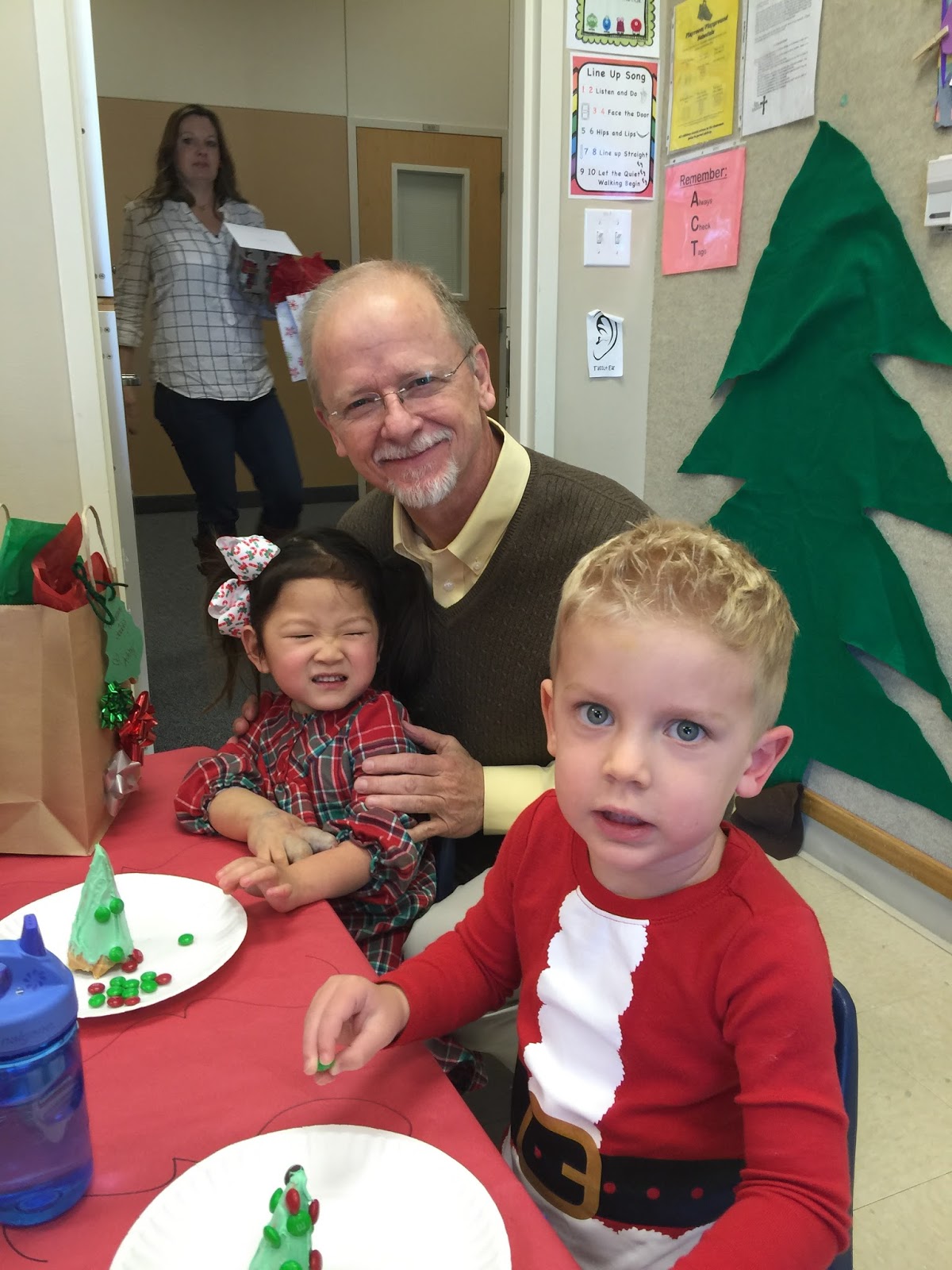 Last Thursday, Kensington was a reindeer and had lines in ‘Twas the Night Before Christmas in her class’s reader’s theater at the exact same time that Ashby had her preschool pajama/Christmas party…so, I called in the troops for reinforcement. Lovie and Papa Jay.