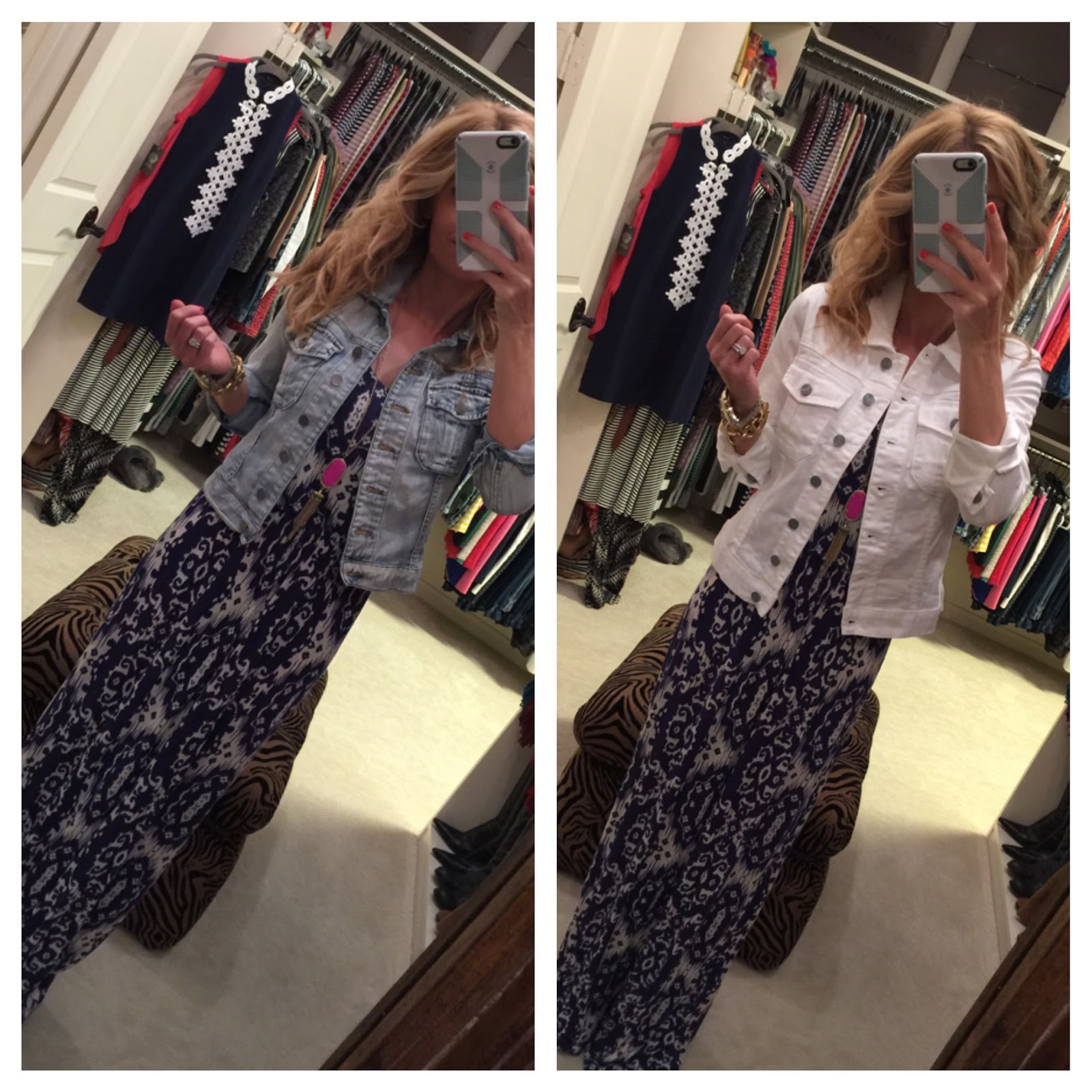 Denim Jacket//White Denim Jacket//Lush Dresses//Tassel Necklace (in both outfit pics but two different colors)