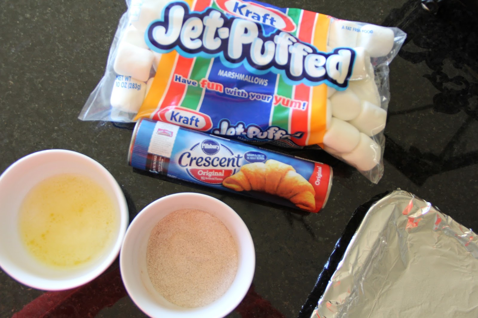 All you need right here: Crescent Rolls, marshmallows, melted butter and a cinnamon/sugar mixture.