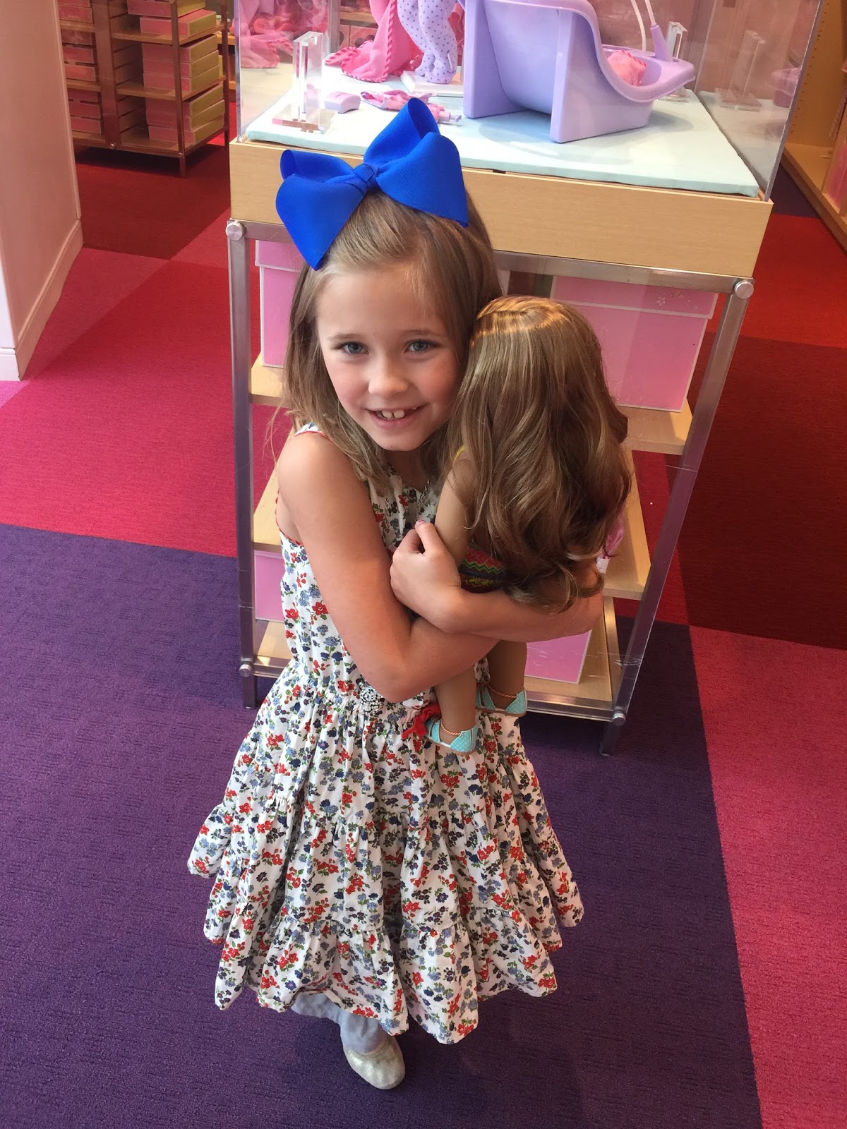 Skip day!! Kensington is my “cries when she’s happy kid”, so the minute she came around the corner at school and saw me (the office had called her class and asked for her to come to the front ready to be dismissed for the day), she burst into happy tears. She was so excited!! Our plan was to go to the American Girl store and have lunch. We were off!