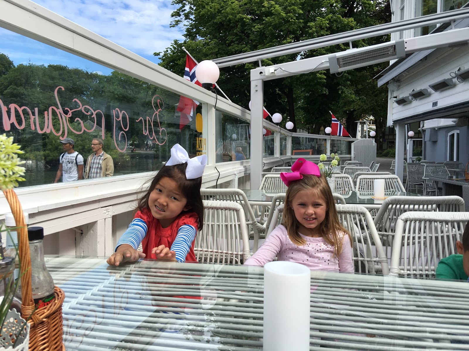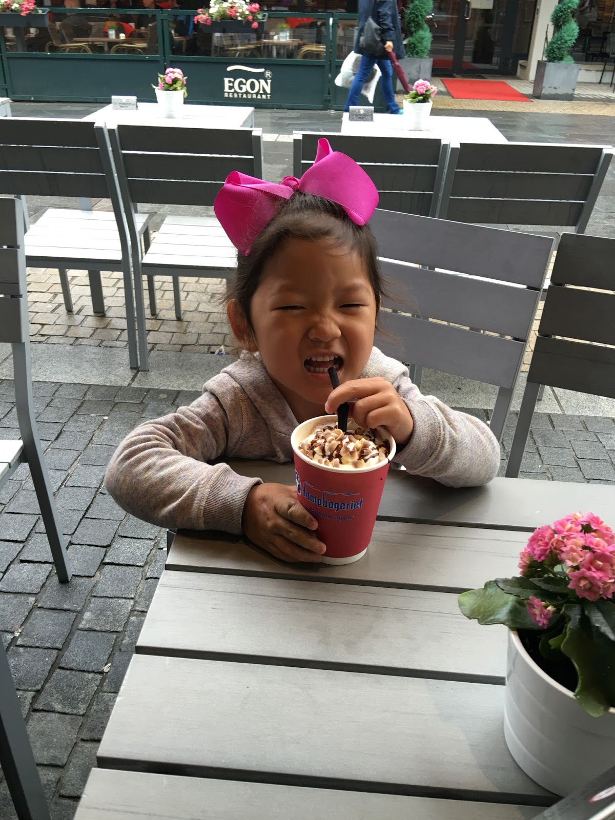 We set off toward the old town part of Kristiansand and decided to duck under the awning of this cafe for coffee and hot chocolate along the way. Smith was being goofy…so that’s why they’re looking at him ;).