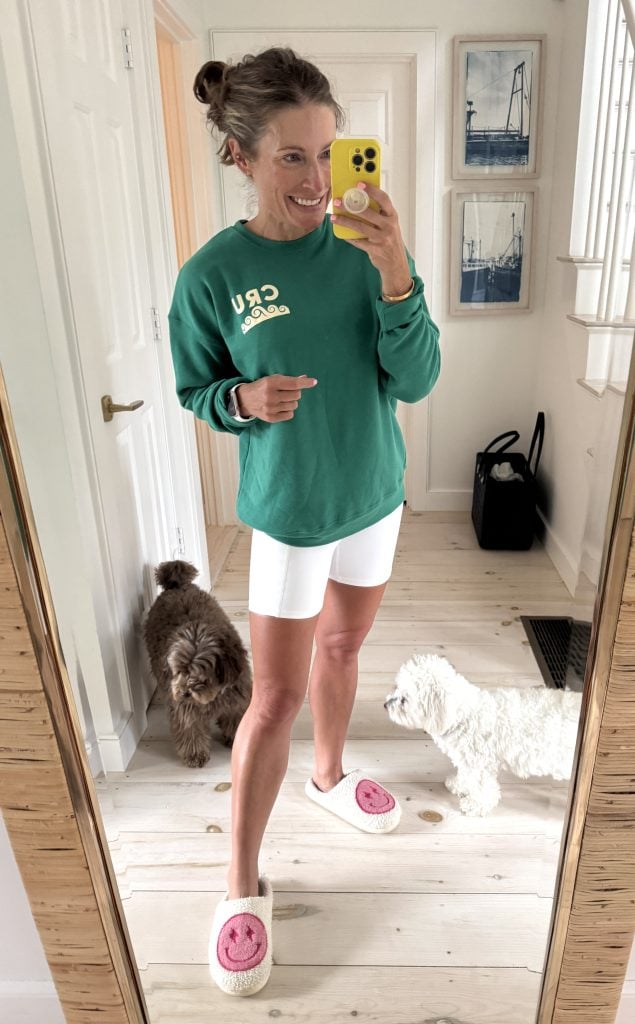 I LOVE your green sweatshirt! That is so cute with the biker shorts.