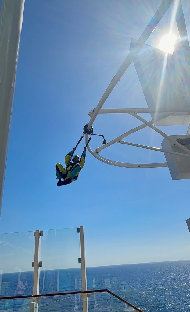 Zip lining over the side of the ship!