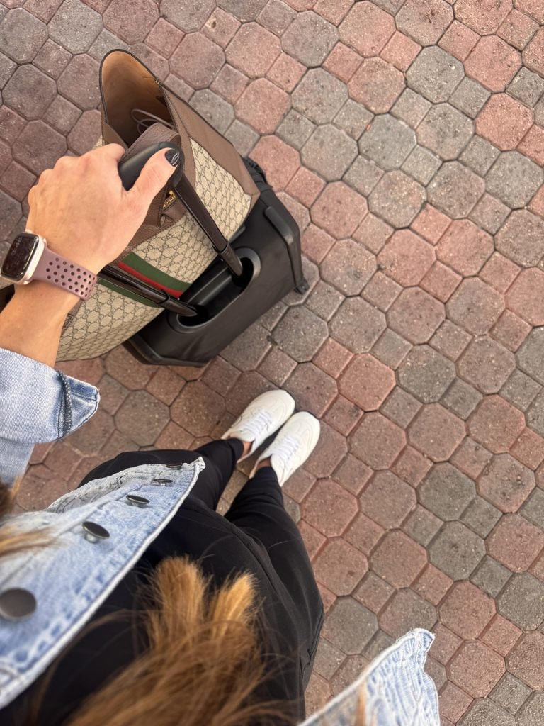 For this quick trip, I had my wallet, my scarf (I always fly with a scarf because I use it as a blanket), my Airpods, Kindle and MacBook.