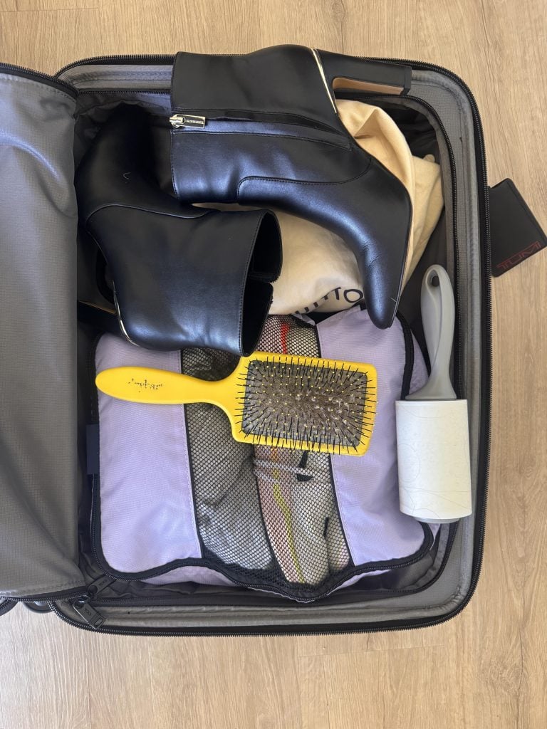 On this side, I have my hairbrush, a lint roller (I wear a lot of black), and one packing cube that had my workout shoes and workout clothes along with undies and a pair of pajamas. I added a pair of booties and heels to round out my outfits.