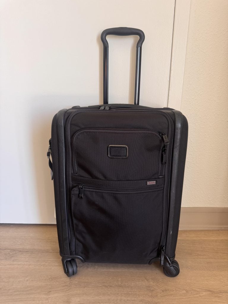 My hubby has the same Tumi carry on. You know you can walk in to any Tumi store and get a personalized piece to put over that black patch in the front? He got his initials in silver made the case look so classy.