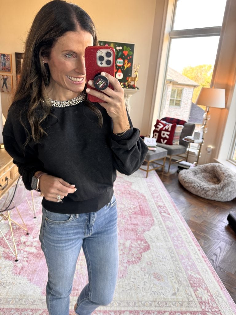 My JAZZY EMBELLISHED SWEATSHIRT is so cute! It’s simple, so comfortable, and yet festive for day or night too!
