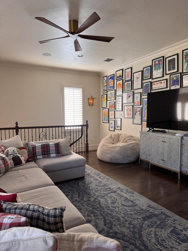 One piece at a time! At the end of each school year, we pick a few of our kids’ favorites and have them matted and framed at Hobby Lobby. We legit started with two from Kensington’s kindergarten year and have gone from there.