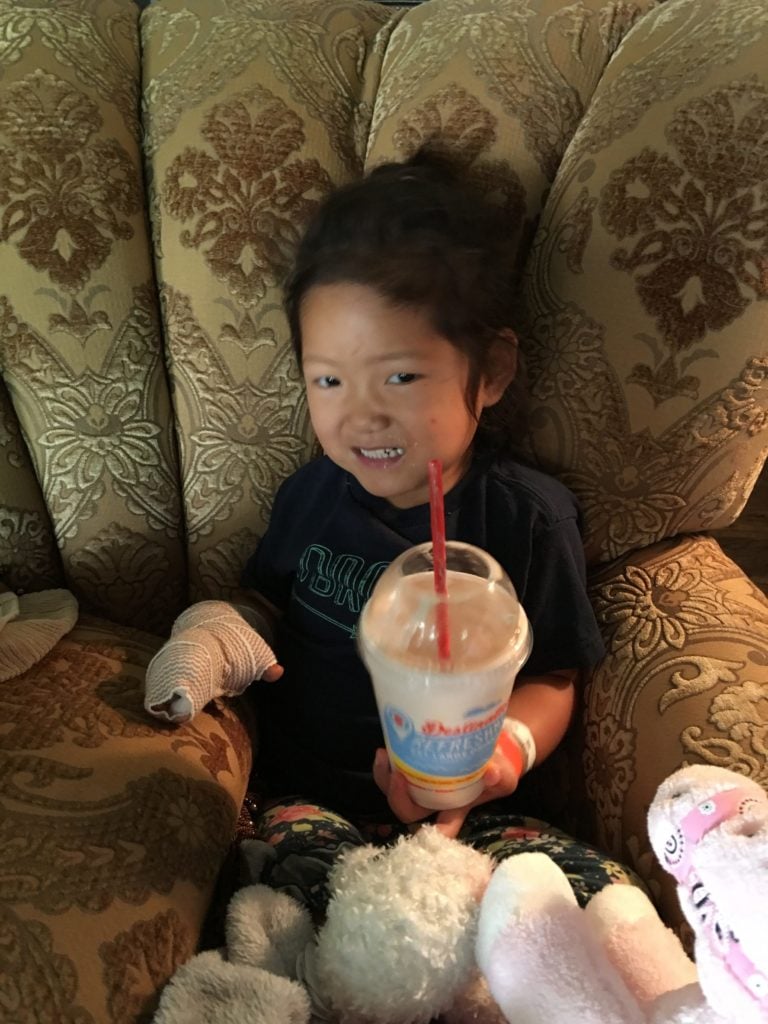 When we arrived at the hospital on Wednesday morning, we checked into our inpatient room prepared for the worst and buckled in for at least one night at the hospital, but goodness gracious, Ashby came out of recovery in the BEST spirits with the least amount of pain, ZERO nausea, and was just doing remarkably well. She did so well that by 6:00 PM, they kicked us out and told us to take our girl home 🙂 . She was doing way too good to have to spend the night. She came home, ate, watched TV, was up and about…thriving. It was just the BIGGEST answered prayer. We’re at home with a darn drain and a cast (she wasn’t happy about either), but other than that, she’s doing GREAT. We are going to spend the next few days hibernating together.