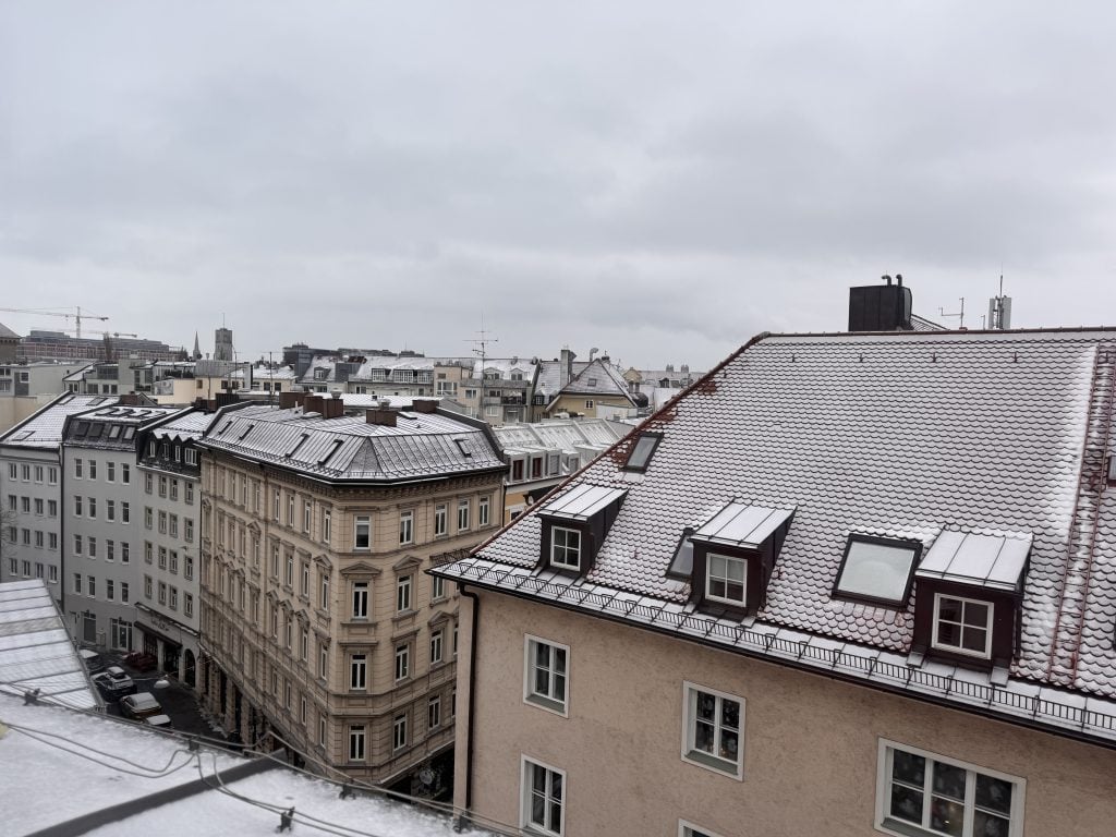 …to just the perfect amount of snow in Munich. It wasn’t heavy snow…just those magical big, fat flakes that make things festive but not freezing/messy/wet. This was the view from my hotel room.