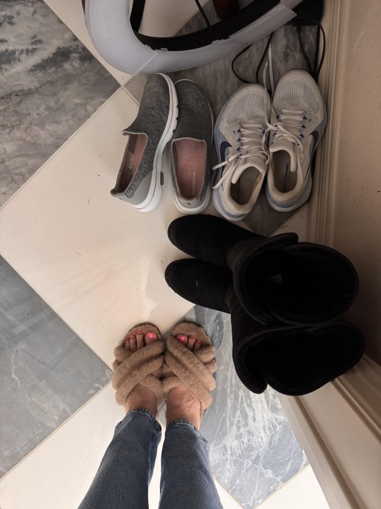 I keep my Nikes (which is what I use for running/walking/working out), my Skechers (for slipping on quickly to walk dogs, head to the mailbox, work in the yard, etc), and my OG tall Ugg boots for cold days.