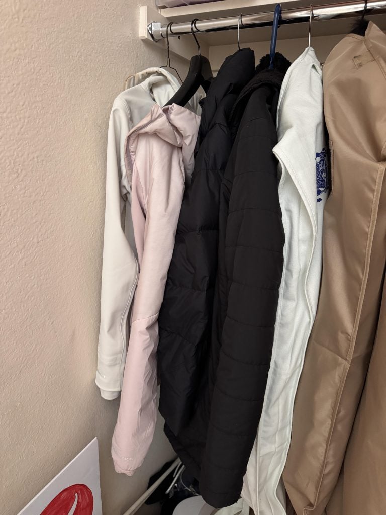 I do actually keep coats in the coat closet too 😉 . I have several different “weights” of coats to put on depending on the weather. From light to heavy, I just keep them there and put one on each morning to walk the dogs.