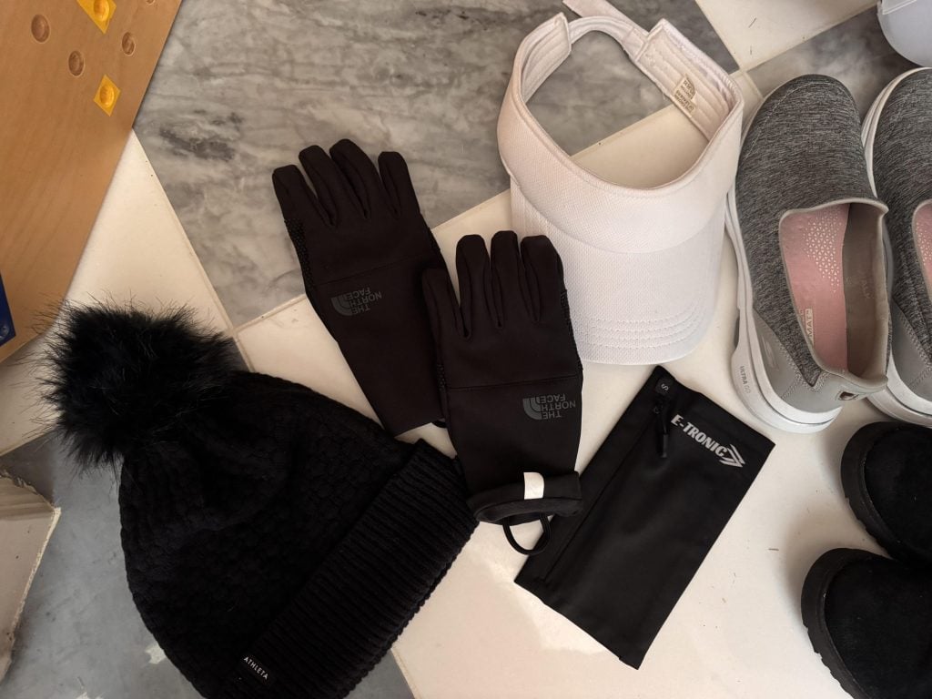 A hat for cold days, gloves for cold days, my arm band for when I run (to carry my phone), and a visor
