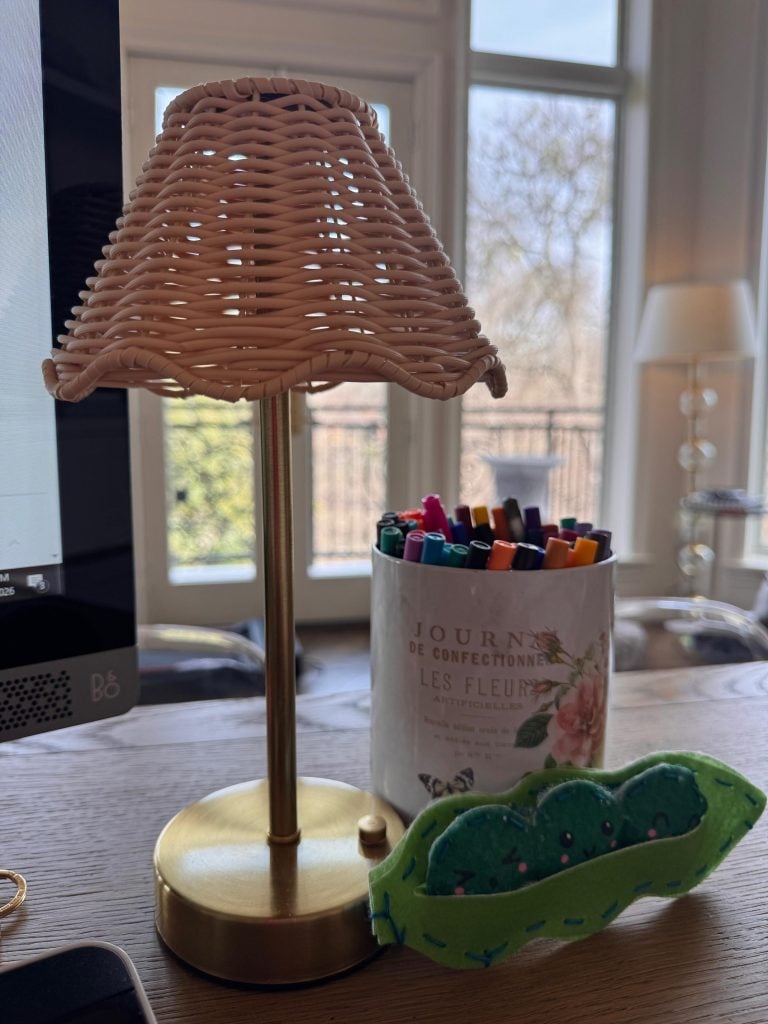 I bought this at Hobby Lobby, and just love it. I wanted a little lamp on my desk, but I didn’t want cords. This is cordless and wonderful.