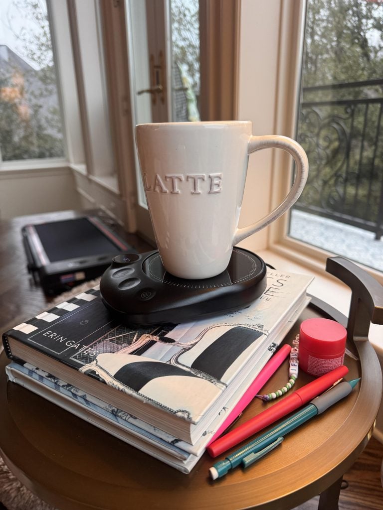 …is my little table with MY COFFEE WARMER (a total game changer for me!)…