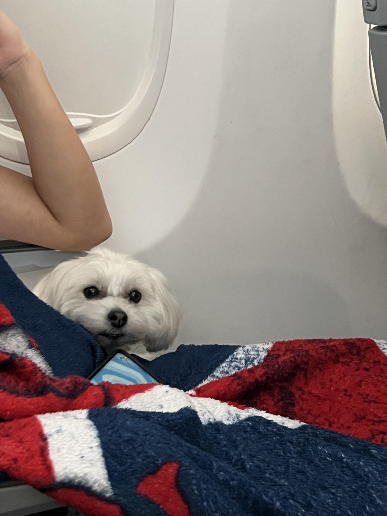 You can read about that in the Frenchie post that I linked. Kensington asked and asked and asked for one for years, and we finally gave in 🙂 . We always keep the dogs in their carrier under the seat in front of us on the plane, but 95% of the time, flight attendants tell us to bring them out so they can see them, snuggle them, etc and let us keep them out. Flight attendants are so sweet to dogs.