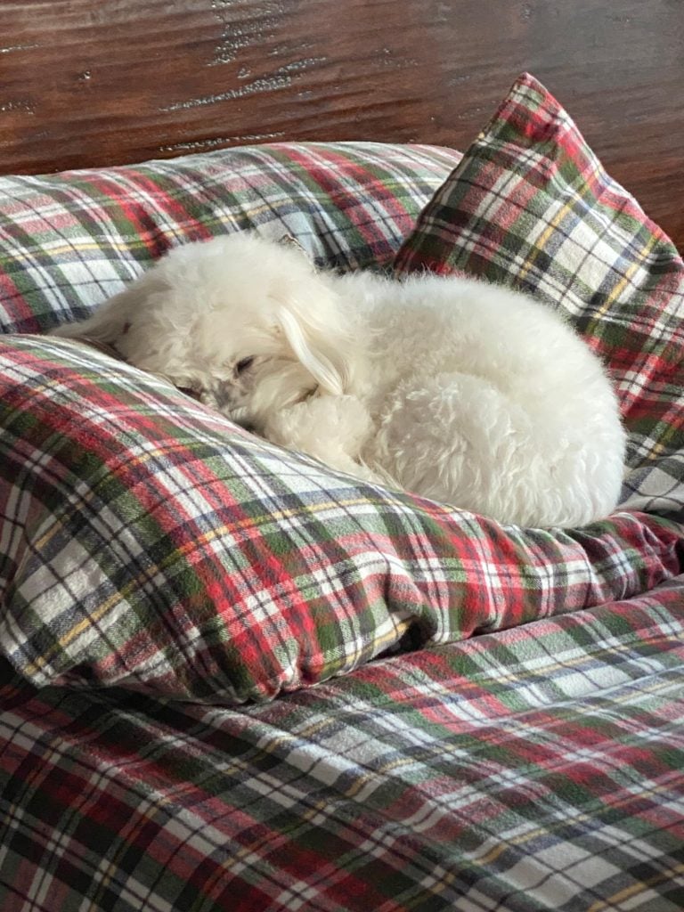 As we were looking through the books, we kept seeing that the coton de tulear breed checked all of our boxes: they are good with kids, they are small, they don’t shed, they have long life expectancies, they have a good temperament, and they sleep a lot.