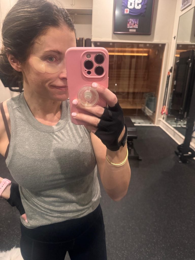 …see? Since I workout at home by myself some days, I always wear them into the gym (and pull them off about 15 minutes in). This is an easy way to wake up my eyes in the AM. By using the small sections too, I extend the jar of patches 🙂 .