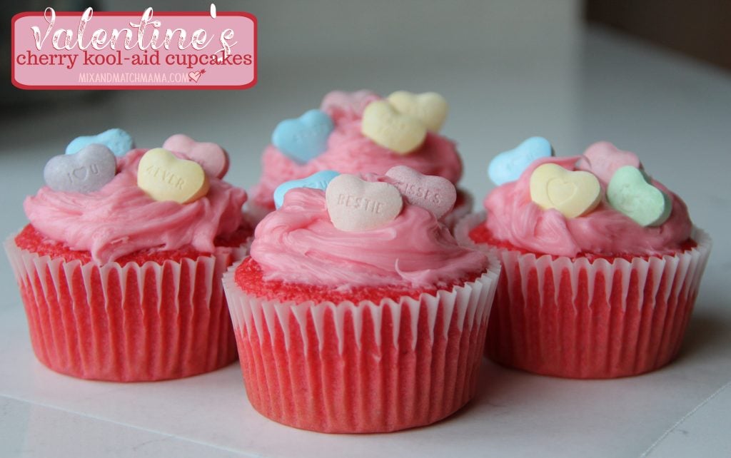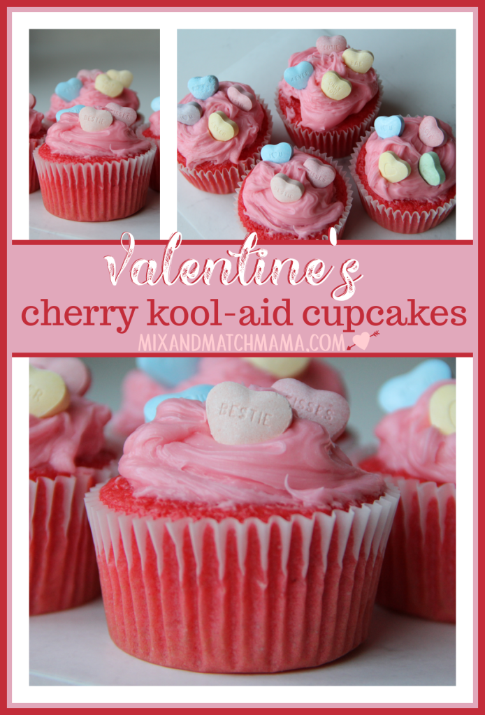 - In a large mixing bowl, prepare white cake mix per box directions. Then using an electric mixer, mix in both packets of cherry Kool-Aid. Poor into lined cupcake tins. Bake 18-20 minutes or until toothpick inserted in the middle comes out clean.