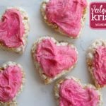 - To make the icing on the top, take your vanilla candy coating and add it to a microwavable bowl along with your vegetable oil. Microwave until the candy coating is melted (again, stopping to stir every 30 seconds). This will take about 2 minutes or so. As soon as it’s melted, quickly add in a little pink food coloring (be quick!) and then spread this on top of your hearts and then top with festive sprinkles. Allow this to cool before serving and enjoying.
