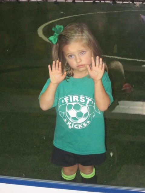 …that she participated in her first sporting event?! This was four year old Kensington at indoor soccer standing at the glass staring at me because she wanted to come off the field. Bahahaha!