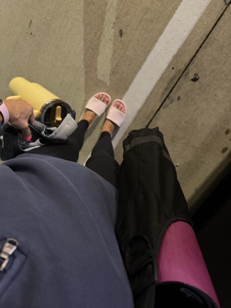 Phones aren’t allowed inside the yoga studio, so I snapped this pic for you in the parking lot. Water, towel, yoga mat, check!