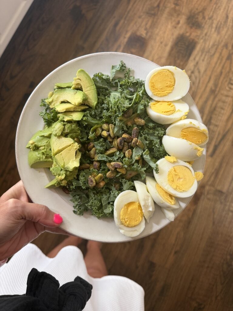 …I stopped for lunch at 1:00. I had those four hardboiled eggs with some kale, salt and vinegar pistachios, half an avocado, and a little of Trader Joe’s hot honey mustard dressing.
