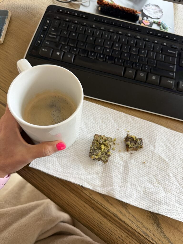 …cup of coffee and had two pieces of the pistachio toffee from Trader Joe’s and then…