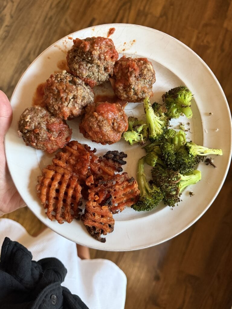 …I popped sweet potato fries in the air fryer, broccoli in the oven and dinner was ready.