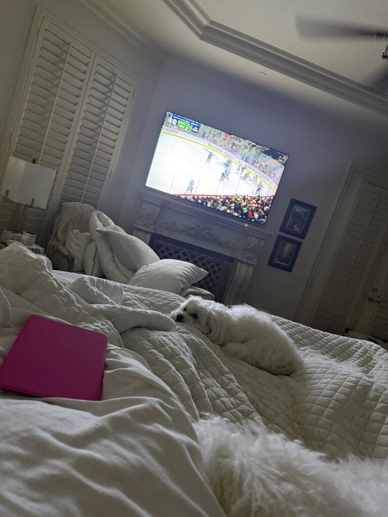 …by 9:00, I was reading my book and watching the Dallas Stars and then fast asleep (with those two dogs).
